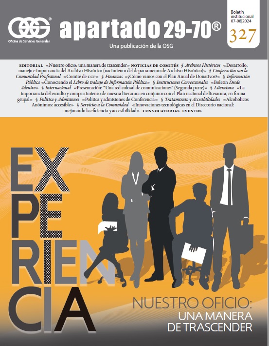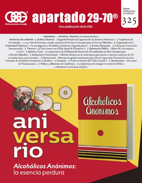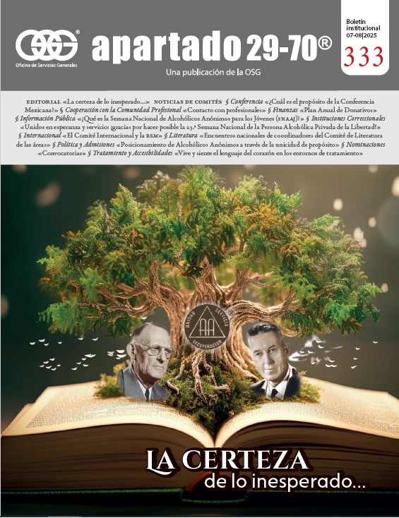 Boletín apartado 29-70 es un órgano de información y servicio a la comunidad de Alcohólicos Anónimos, publicado cada dos meses por la O.S.G. de México. Se distribuye gratuitamente a todos los grupos de Alcohólicos Anónimos que se encuentran registrados en la Central Mexicana de Servicios Generales de Alcohólicos Anónimos, A.C. Si deseas obtener una suscripción personal por un año ponte en contacto con la O.S.G.