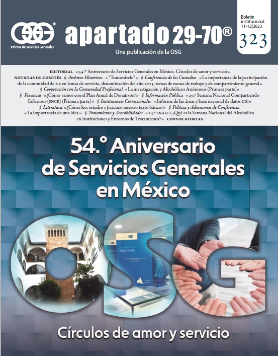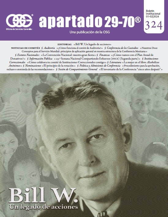 Boletín apartado 29-70 es un órgano de información y servicio a la comunidad de Alcohólicos Anónimos, publicado cada dos meses por la O.S.G. de México. Se distribuye gratuitamente a todos los grupos de Alcohólicos Anónimos que se encuentran registrados en la Central Mexicana de Servicios Generales de Alcohólicos Anónimos, A.C. Si deseas obtener una suscripción personal por un año ponte en contacto con la O.S.G.