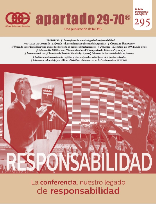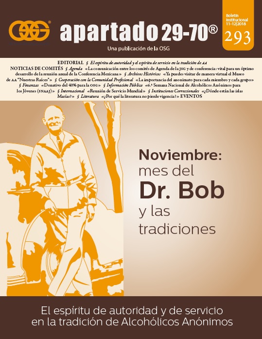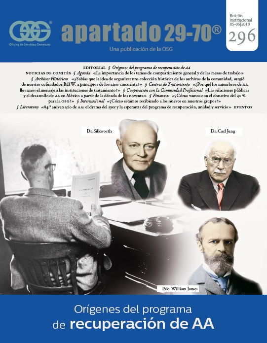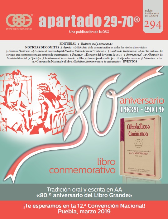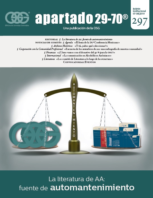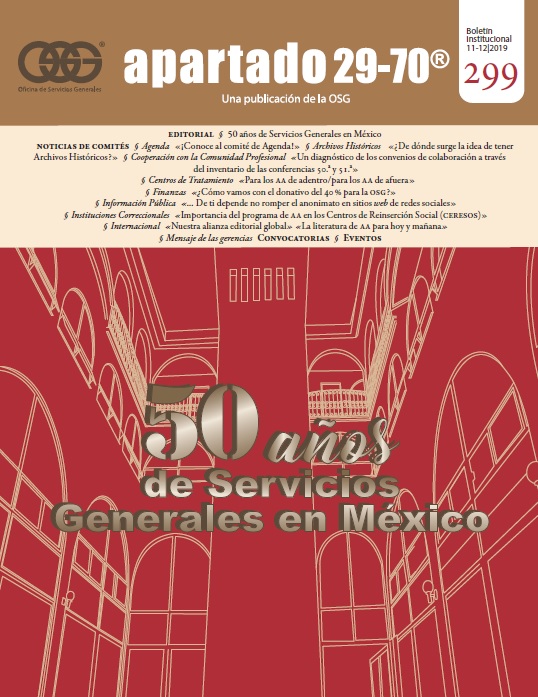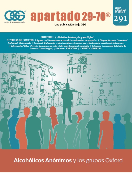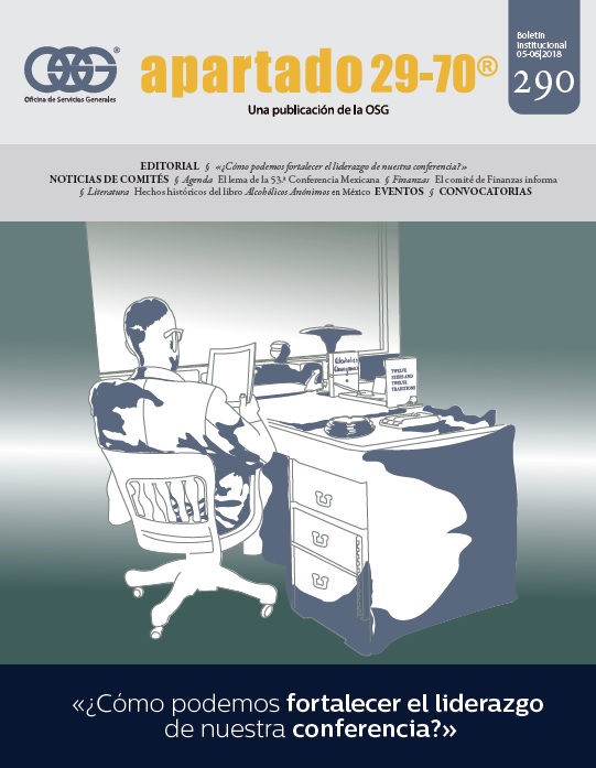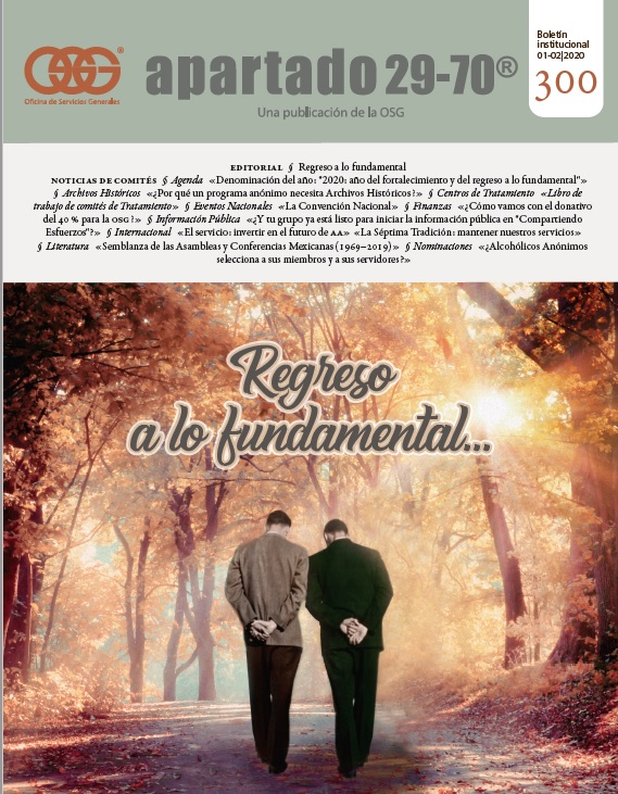 Boletín apartado 29-70 es un órgano de información y servicio a la comunidad de Alcohólicos Anónimos, publicado cada dos meses por la O.S.G. de México. Se distribuye gratuitamente a todos los grupos de Alcohólicos Anónimos que se encuentran registrados en la Central Mexicana de Servicios Generales de Alcohólicos Anónimos, A.C. Si deseas obtener una suscripción personal por un año ponte en contacto con la O.S.G.